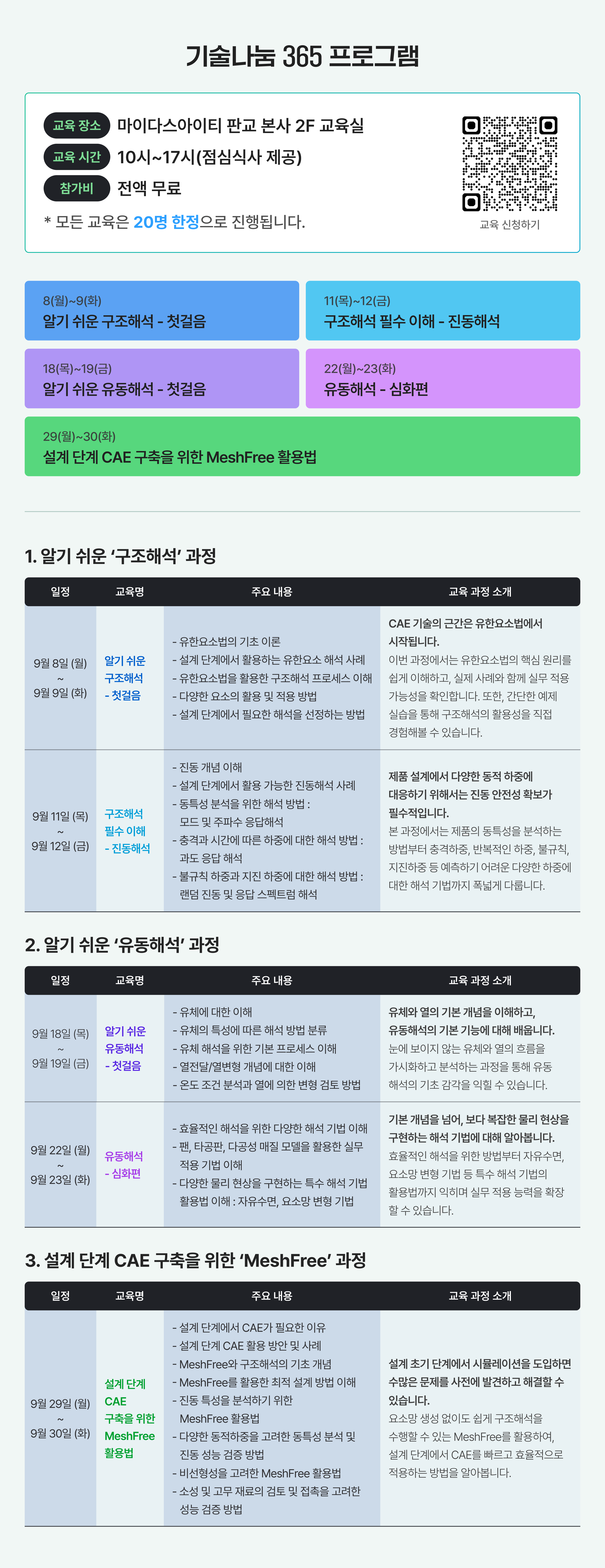 마이다스아이티 CAE M클래스 [M클래스/오프라인] 기술나눔 365, 설계자를 위한 시뮬레이션 교육의 새로운 패러다임 Aug 21, 2025 10:04:39 AM ★ 모든 교육 과정 신청이 마감되었습니다.★ 📚 365일, 누구나 무료로 배우는 CAE 교육 실무 역량과 노하우를 한 번에!💡 개인 성장부터 팀 경쟁력 강화까지!🚀 지금 바로 교육 신청하고 설계 역량과 업무 효율을 모두 잡아보세요.※교육은 회당 20명 정원으로 진행됩니다. 조기 마감 전에 빠른 신청 부탁 드립니다. 목록보기 Recent Popular