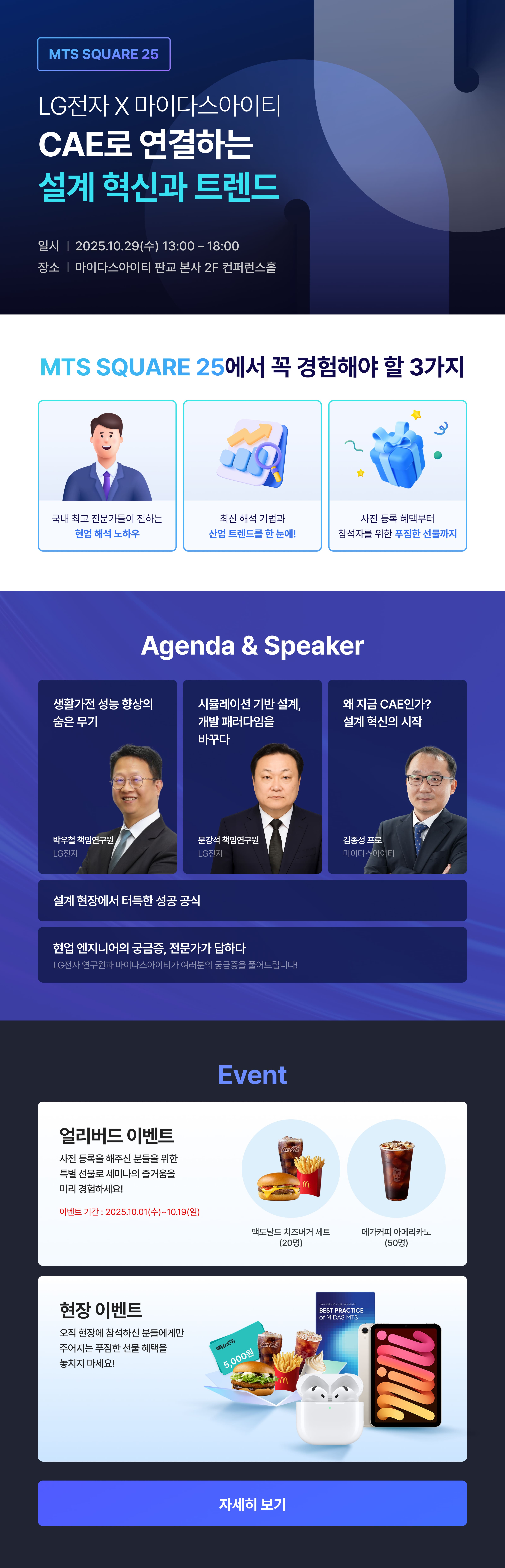 마이다스아이티 CAE M세미나 국내 최대 규모 기계 분야 CAE 기술 세미나, MTS SQUARE 25에 초대합니다 (10/29, 판교) Oct 1, 2025 10:45:07 AM 국내 최대 규모로 진행되는 기계 분야 CAE 기술 세미나 MTS SQUARE 25에 여러분을 초대합니다!🚀 ⚡ 복잡한 설계 과정을 단축하는 시뮬레이션 활용 전략 📊 산업별 사례로 확인하는 최신 해석 트렌드 🎯 전문가 강연과 Q&A 세션으로 찾는 실무 해법 🎁 사전 등록 얼리버드 혜택부터 참석자를 위한 푸짐한 선물까지! 목록보기 Recent Popular